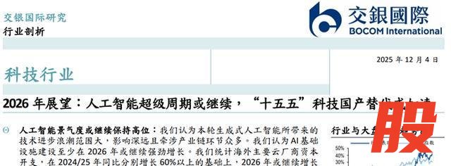 具体到人工智能领域,交银国际认为,本轮生成式人工智能所带来的技术进步浪潮范围大,影响深远且牵涉产业链环节众多,AI基础设施建设至少在2026年或继续强劲增长。